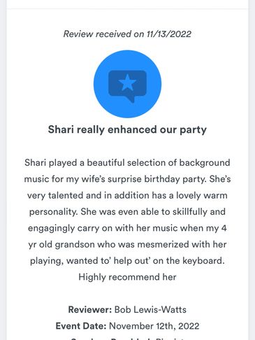 Hi lovely Shari! Thank you so much for being there and playing your lovely music. Everyone was so happy and loved the music. They were all complimenting The Pianist all day. Thank you again and I hope you enjoyed yourself.